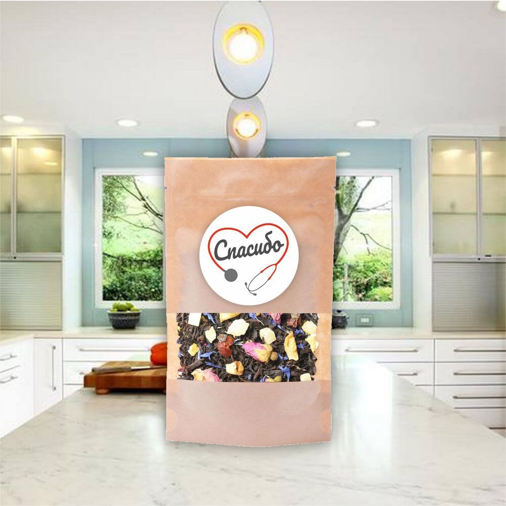 | Состав чая | чай черный индийский, кусочки ананаса, кусочки яблок, плоды шиповника измельченные, цедра апельсина, бутоны роз, лепестки роз, кусочки клубники, лепестки василька, аромат клубники. |