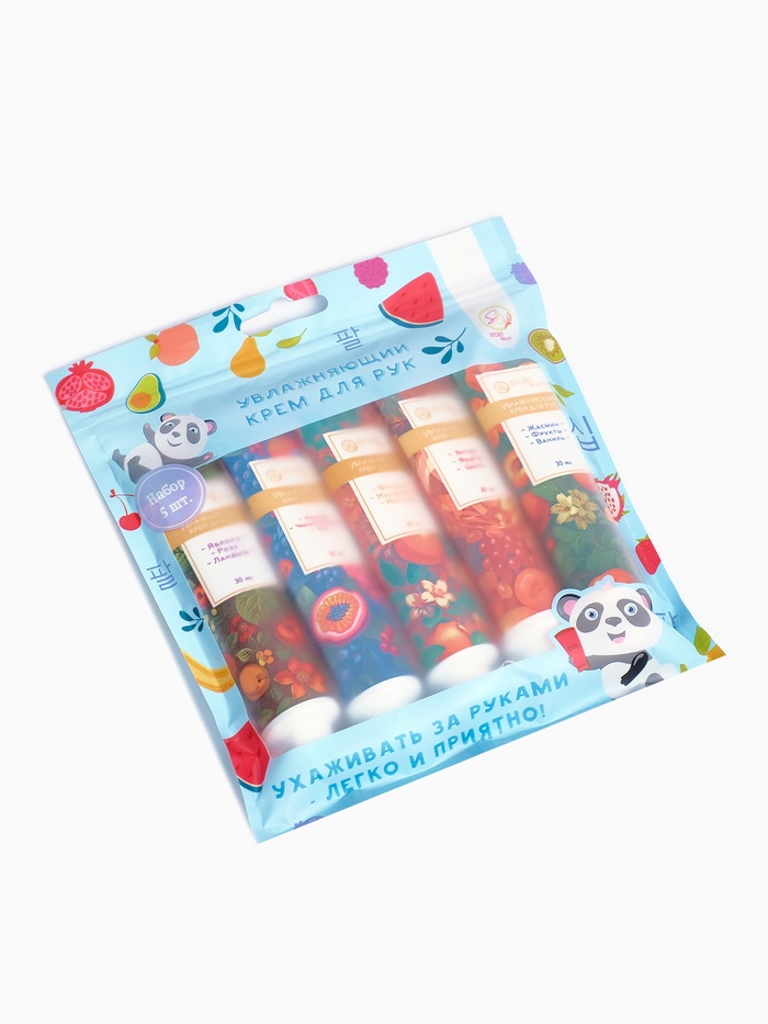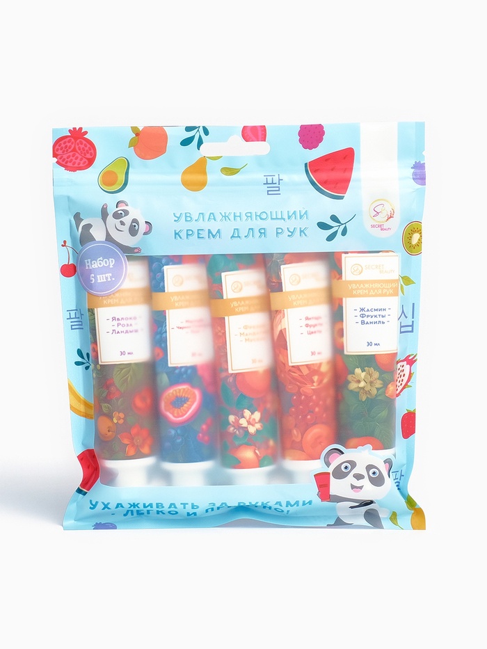 В набор входят увлажняющие крема: Крем для рук «Маракуя, чёрная смородина, пион» 30 мл, Крем для рук «Жасмин, фрукты, ваниль» 30 мл, Крем для рук «Фрезия, мандарин, мускус» 30 мл, Крем для рук «Яблоко, роза, ландыш» 30 мл, Крем для рук «Цветы, фрукты, янтарь» 30 мл.