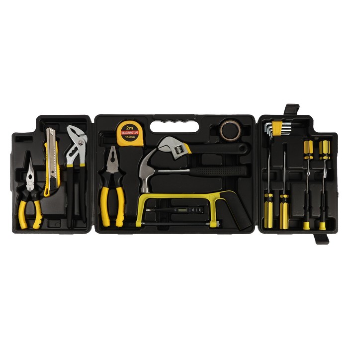 Порядок и мобильность: Весь инструмент аккуратно хранится в прочном пластиковом кейсе с удобной ручкой. Компактный чемоданчик можно взять с собой в гараж, на дачу или хранить дома, экономя место. Каждый предмет лежит на своём месте, что экономит время на поиски. Это базовый набор для дома, который станет надежным помощником и для новичка, и для опытного мастера.