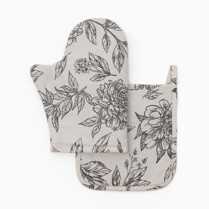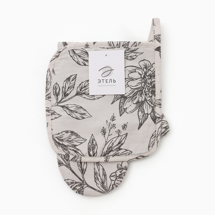 Этот набор кухонных прихваток в стиле Black Flowers станет практичным и тёплым дополнением для вашего дома. Комплект из двух моделей — классической квадратной и удобной варежки — закрывает все основные потребности у плиты. Плотный 100% хлопок саржевого переплетения надёжно защищает руки от жара и брызг, а изящный цветочный принт на бежевом фоне добавляет кухне уюта и стиля.