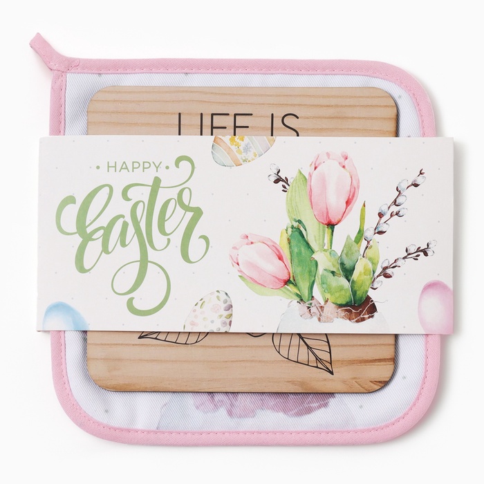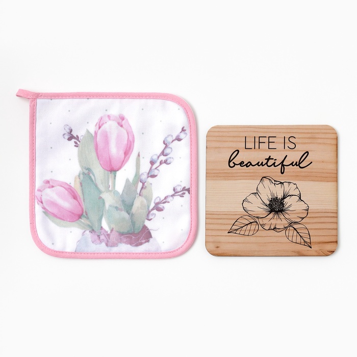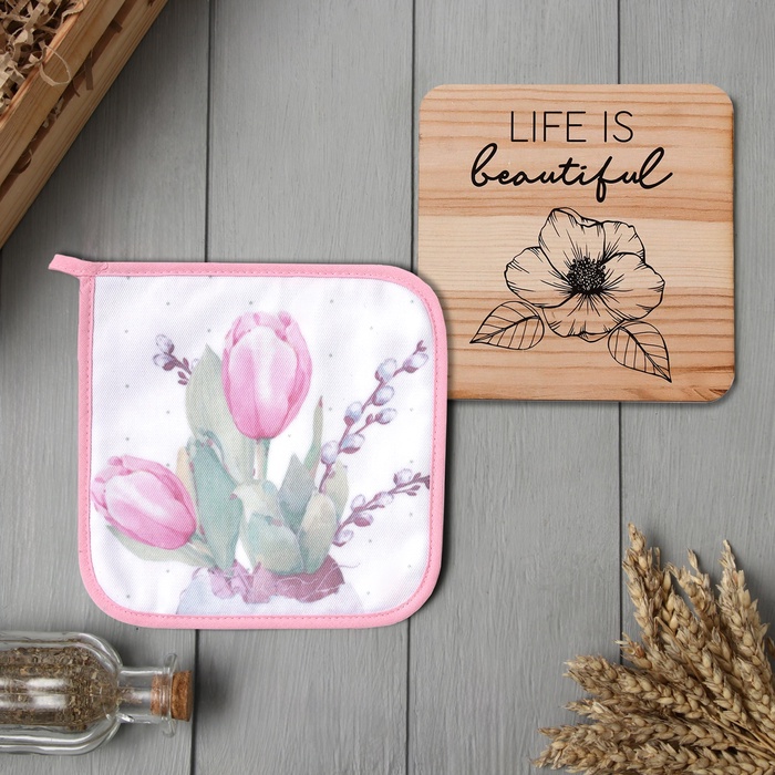 Набор кухонных аксессуаров с тюльпанами — это практичный и тёплый подарок к 8 Марта. Две вещи из плотного хлопка защитят руки и стол, а нежный цветочный рисунок создаст весеннее настроение на кухне каждый день.