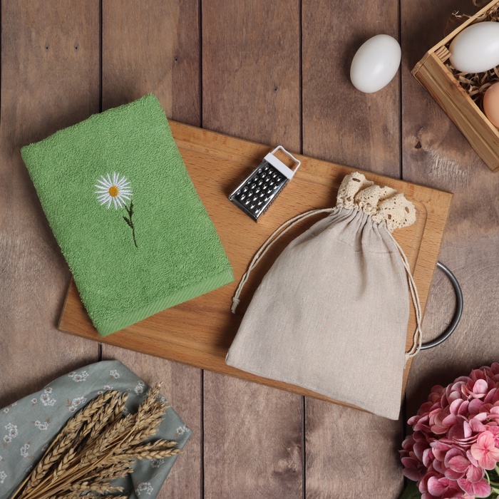 Набор из махрового полотенца и кухонной тёрки в зелёных тонах с цветочной тематикой — это практичный и тёплый подарок для дома. Комплект в готовой подарочной упаковке подойдёт для любого повода, особенно к 8 Марта, и станет приятным знаком внимания для близкого человека.