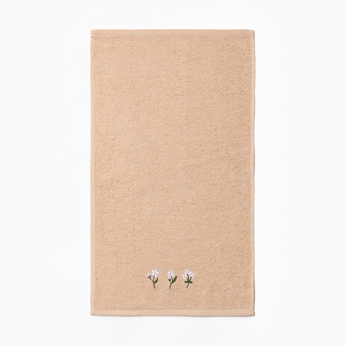 - Нежный бежевый фон с цветочным рисунком и декоративной нашивкой.