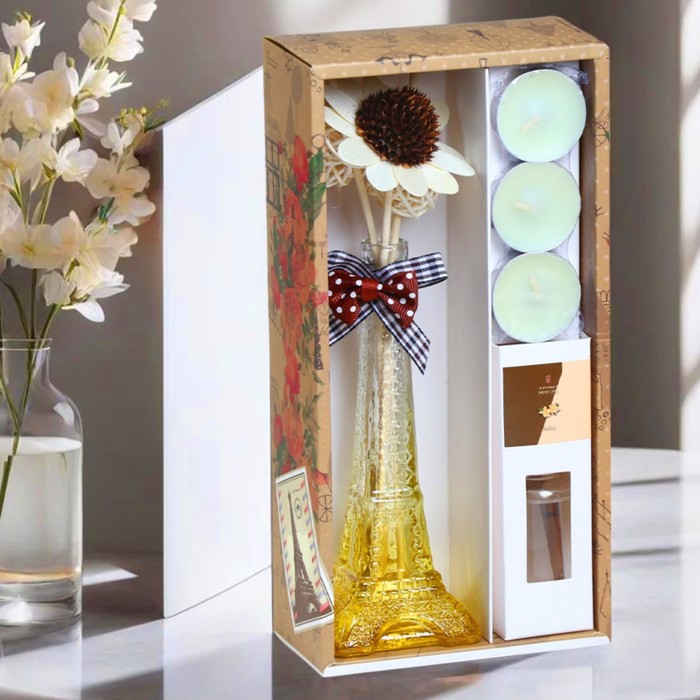 Ощутите волшебство Парижа прямо у себя дома с нашим уникальным набором в стиле Эйфелевой башни. Этот диффузор, выполненный в форме изящного символа Франции, не только наполнит ваш дом уютом, но и придаст ему неповторимый шарм. В комплекте с диффузором вы найдете чайные свечи, создающие приглушенное освещение и добавляющие нотки романтики в атмосферу, а также аромамасло, которое наполнит помещение нежным, умиротворяющим ароматом. Разгрузите свой день и погрузитесь в атмосферу спокойствия и расслабления с нашим набором, который привнесет в вашу жизнь частичку волшебства Парижа.