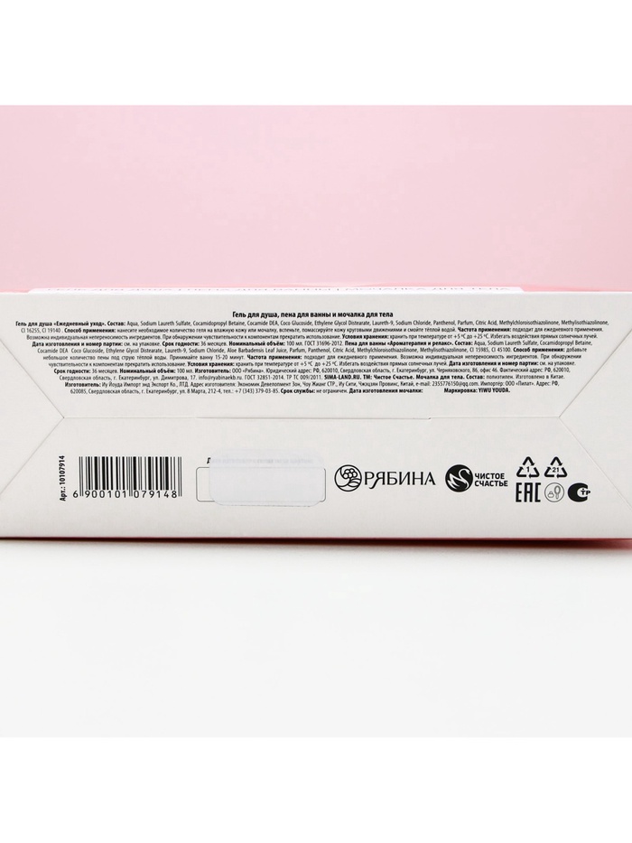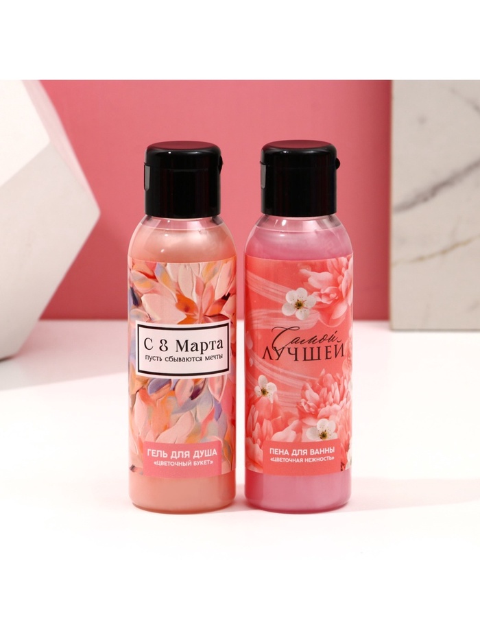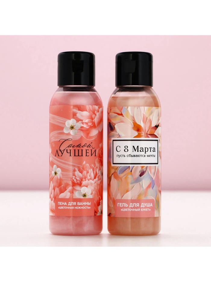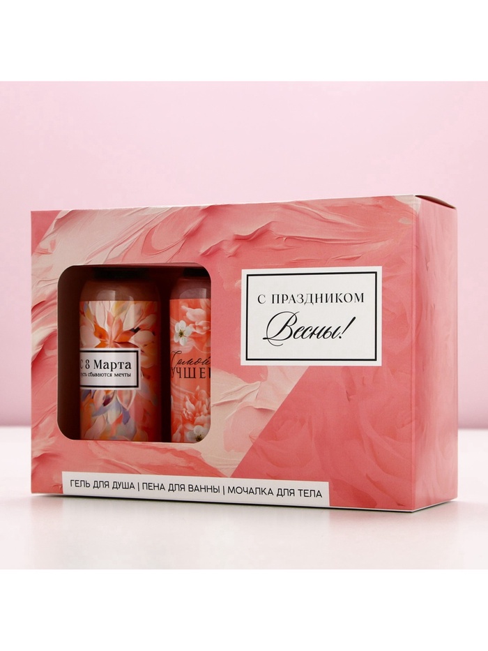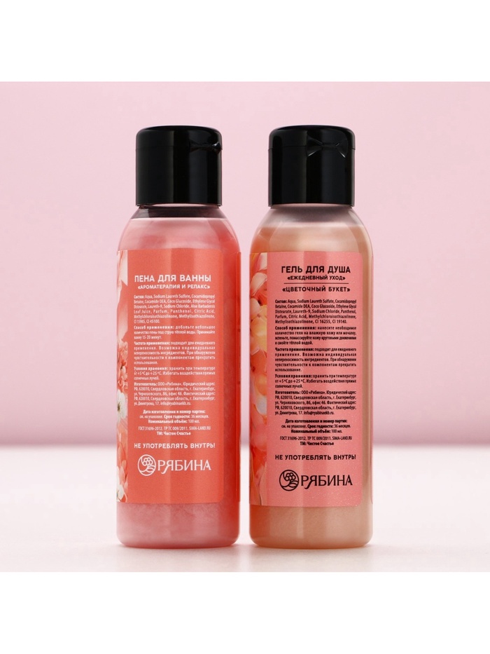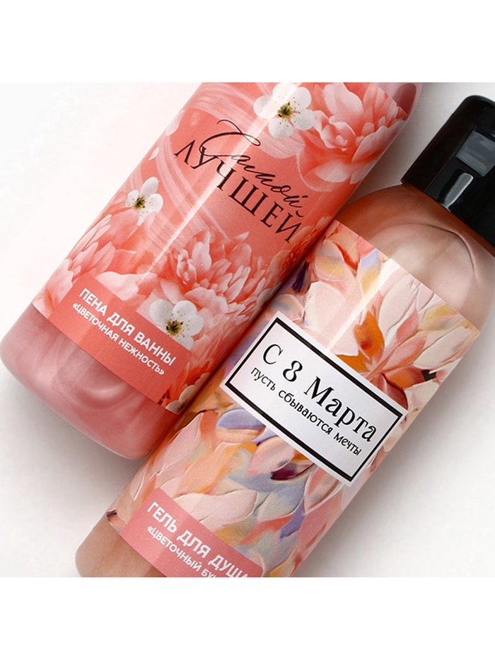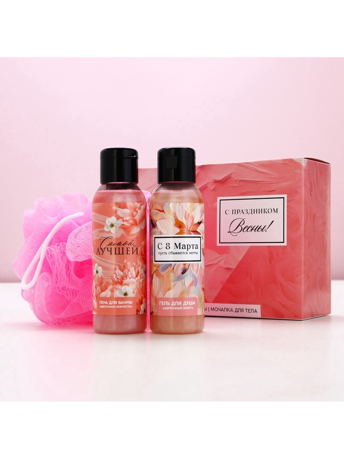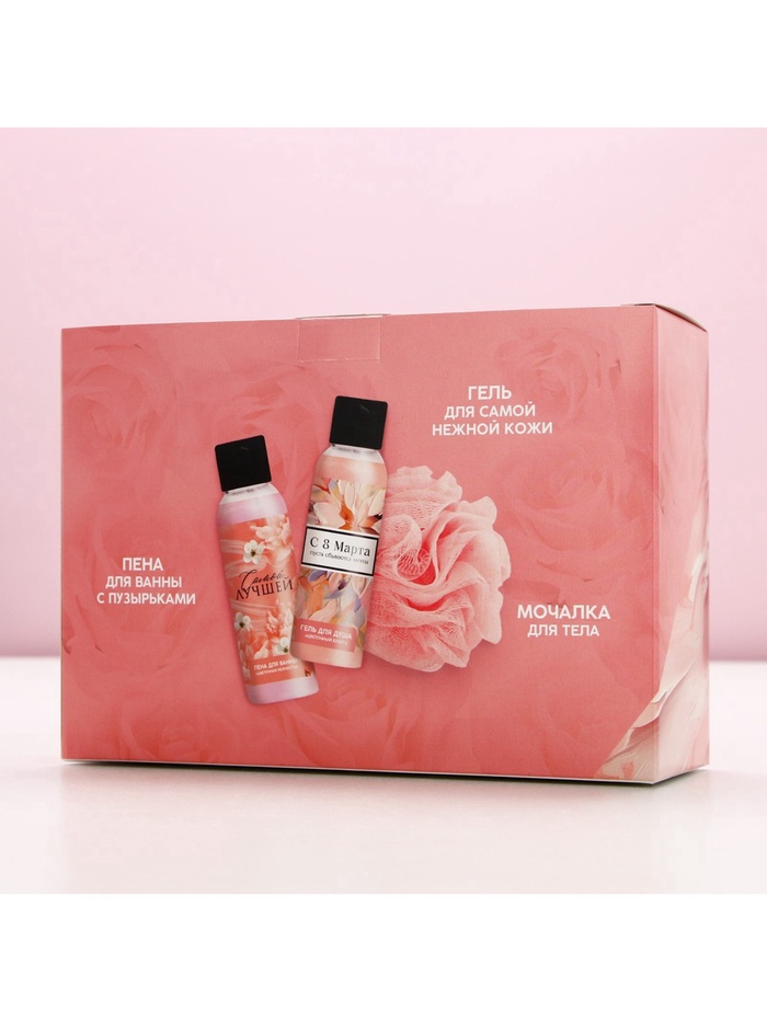 - Составляющие набора: Мочалка, Гель для душа, Пена для ванн