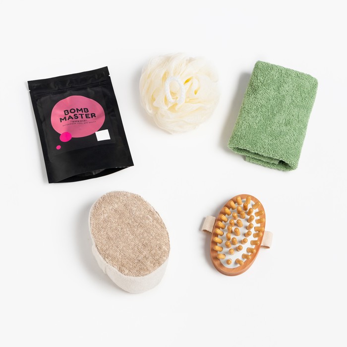 - Составляющие набора: Полотенце, Мочалка, Массажёр, Мочалка-спонж, Соль для ванны