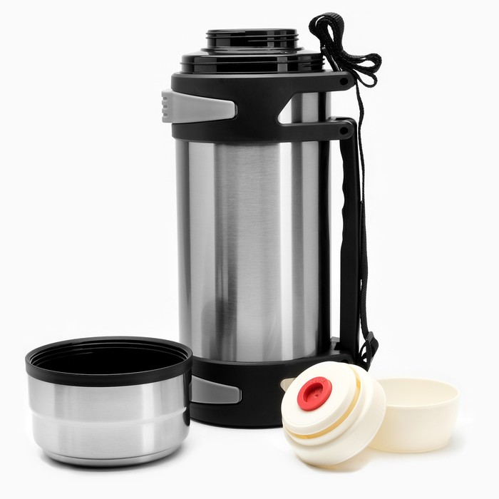 Сохраняет тепло горячих и холодных напитков до 24 часов благодаря высококачественным материалам – нержавеющей стали, пластику и силикону. Герметичная крышка предотвращает протекание, а ремешок из текстиля делает термос удобным для переноски.
