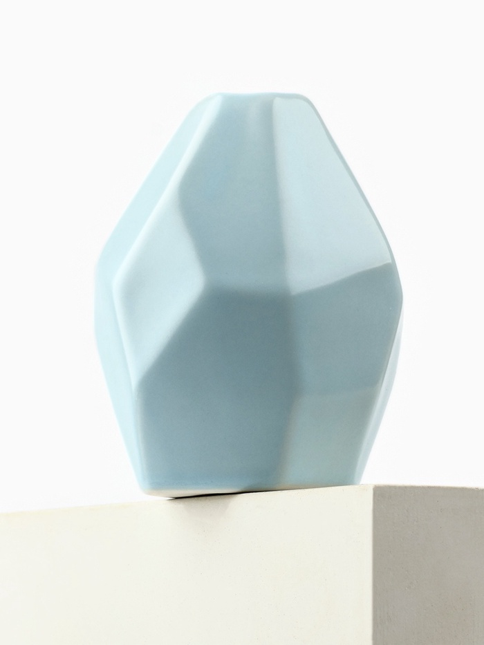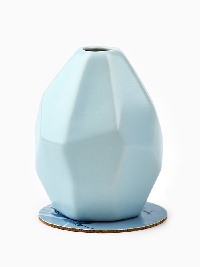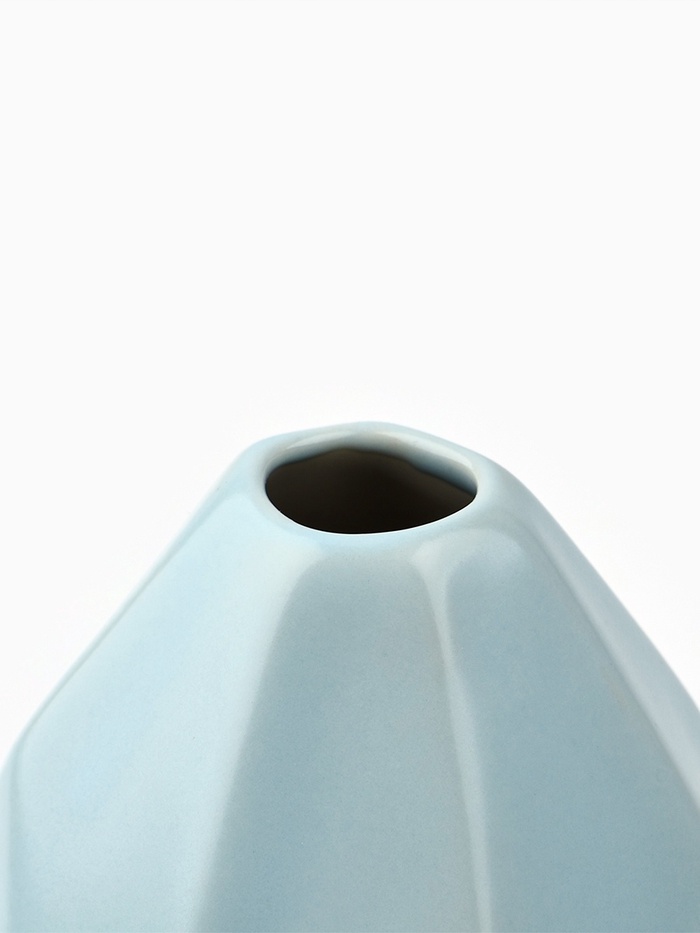Ваза выполнена в форме геометрического тела, с гладкой поверхностью светло-голубого цвета.