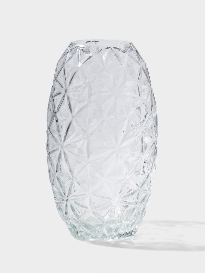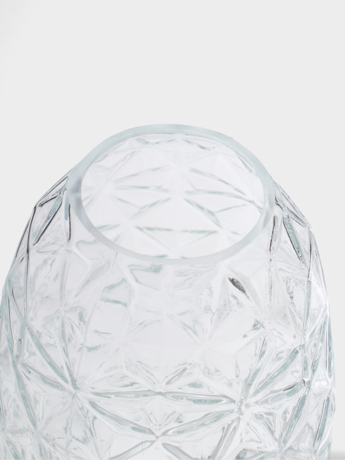 - Выразительный рельеф: Поверхность вазы украшена геометрическим узором. Он улавливает и преломляет свет, наполняя стекло динамикой и внутренним сиянием даже без цветов внутри.