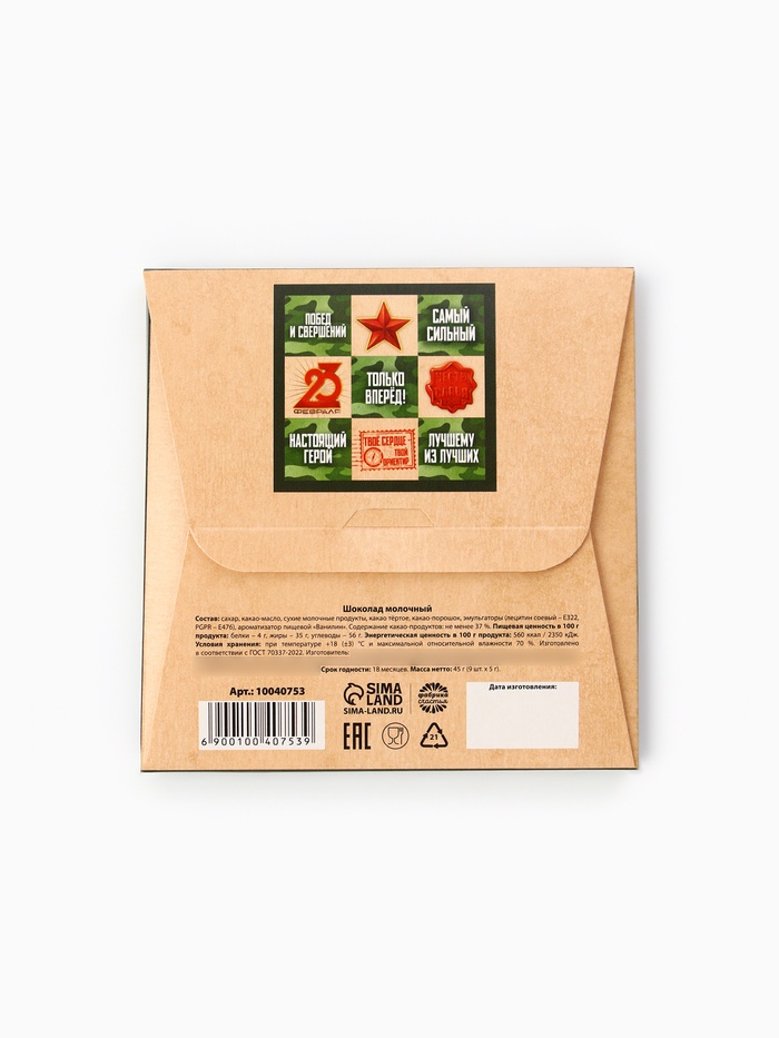 Состав: сахар, какао-масло, сухие молочные продукты, какао тёртое, какао-порошок, эмульгаторы (лецитин соевый - Е322, PGPR - Е476), ароматизатор пищевой "Ванилин".
