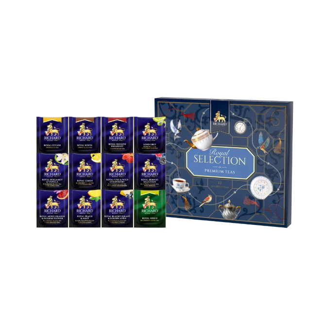 Ассорти из 12 превосходных вкусов: классические чёрные и зелёный, а также фруктовые чаи, по шесть сашетов каждого, в эргономичной коробке с выдвижной основой.