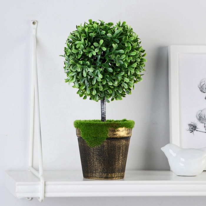 - Идеальный размер для декора: Высота композиции — 23 см. Такой самшит гармонично впишется на книжную полку, рабочий стол, комод или подоконник, став акцентным элементом, не загромождающим пространство.