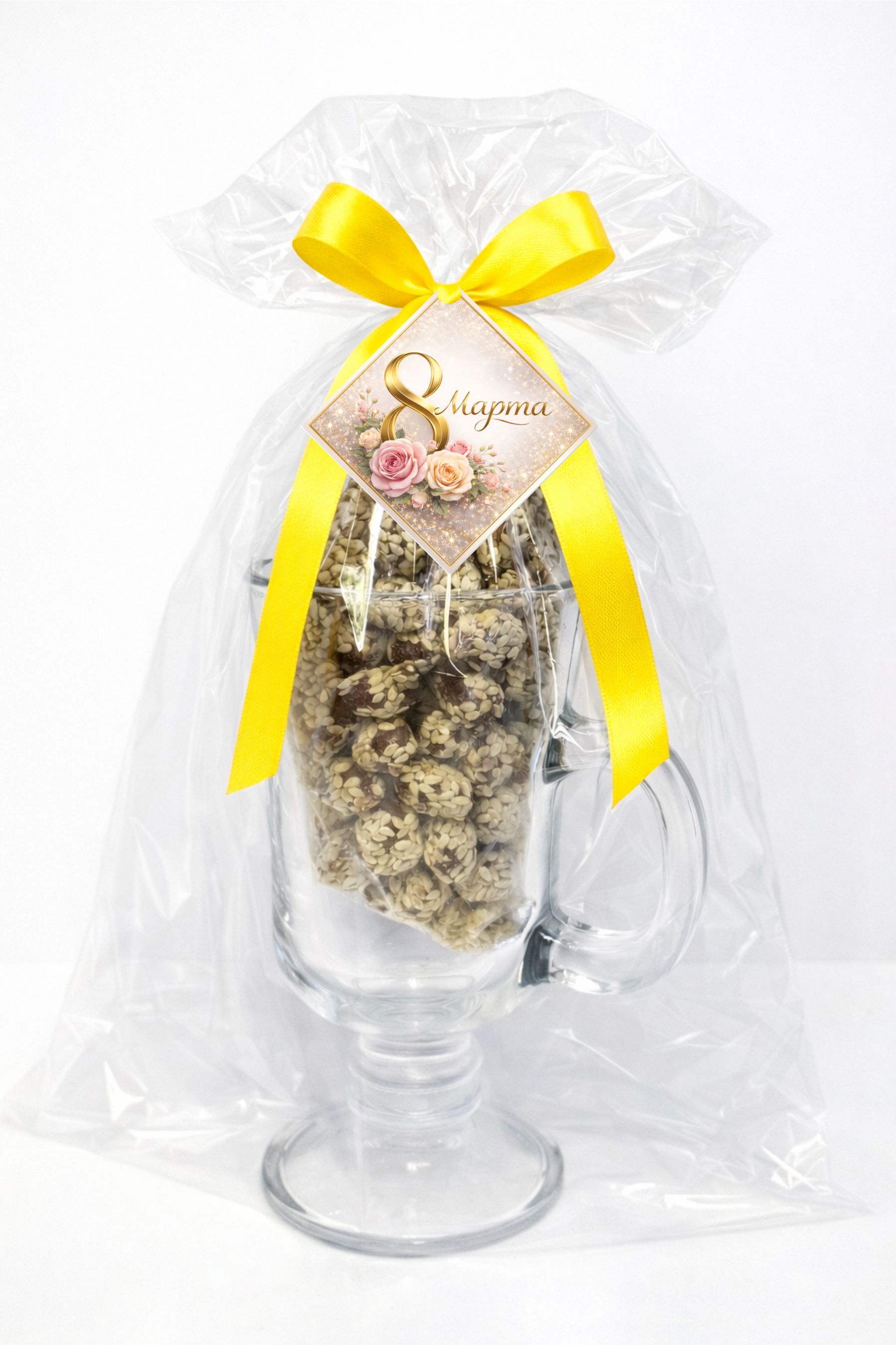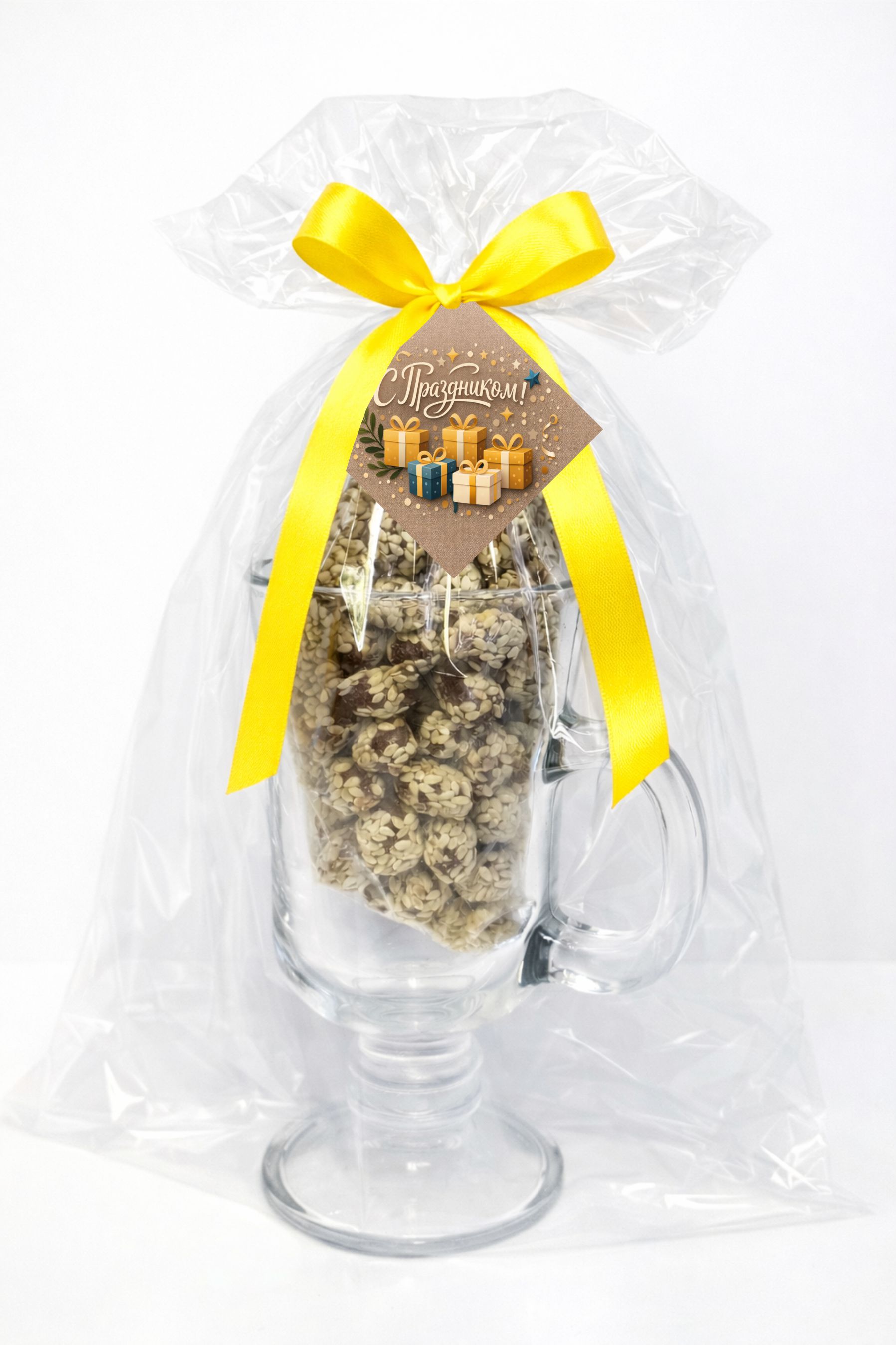 | Составляющие набора | - Арахис (драже) в кунжуте с медом 80гр - Кружка “Глинтвейн” 200 мл - Пакет с клеевым клапаном 110*150 - Пакет прозрачный 235х310 мм - Наклейка d 5см - Лента 0,50 м |