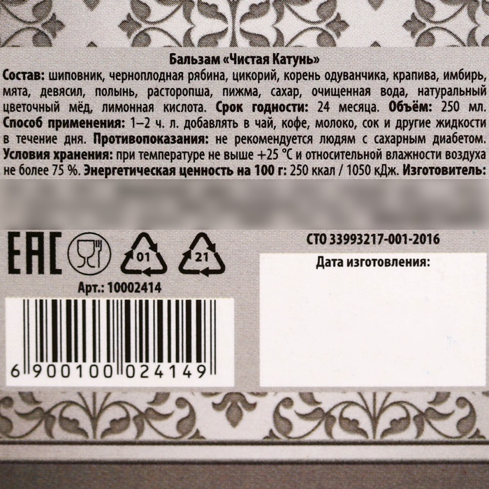 Состав: шиповник, черноплодная рябина, цикорий, корень одуванчика, крапива, имбирь, мята, девясил, полынь, расторопша, пижма, сахар, очищенная вода, натуральный цветочный мёд, лимонная кислота.