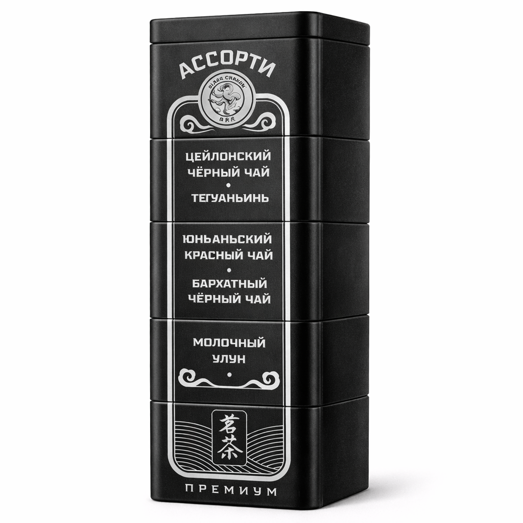 Ассорти "Чёрный" от марки «Черный дракон» — это листовой чай, выпускаемый в подарочной жестяной банке весом 125 грамм (5 видов чая по 25 г)