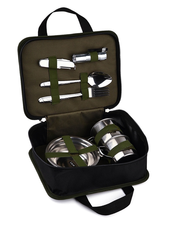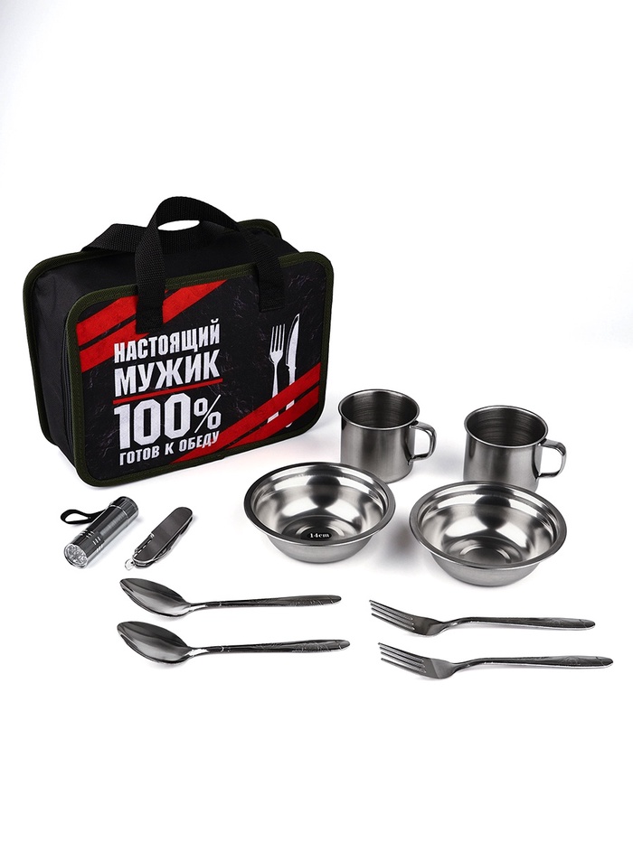 • Составляющие набора: Тарелка, Вилка, Ложка, Мультитул, Фонарик, Кружка
