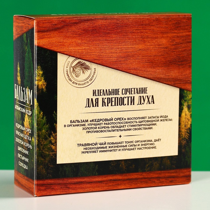Состав: шиповник, черноплодная рябина, солодка, пустырник, бадан, золотой корень, красная щётка, чага, кедровый орех, сахар-песок, вода очищенная, мёд натуральный.