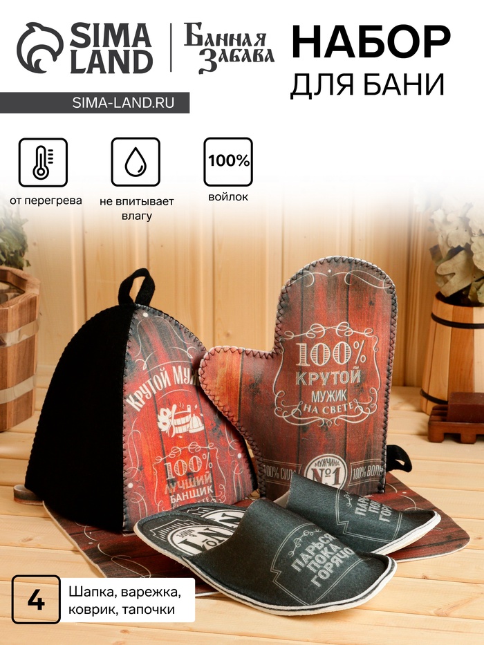 - Комплект для полноценного отдыха: в набор входит всё необходимое: шапка для защиты от перегрева, рукавица для защиты от ожога рук, банный коврик и удобные тапочки. Не нужно докупать ничего отдельно.