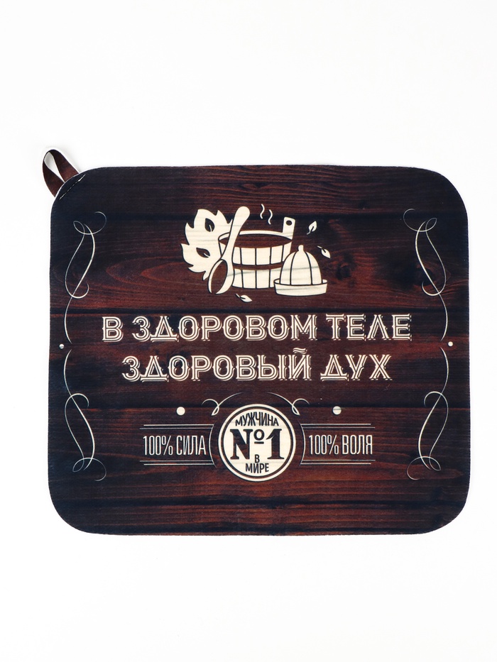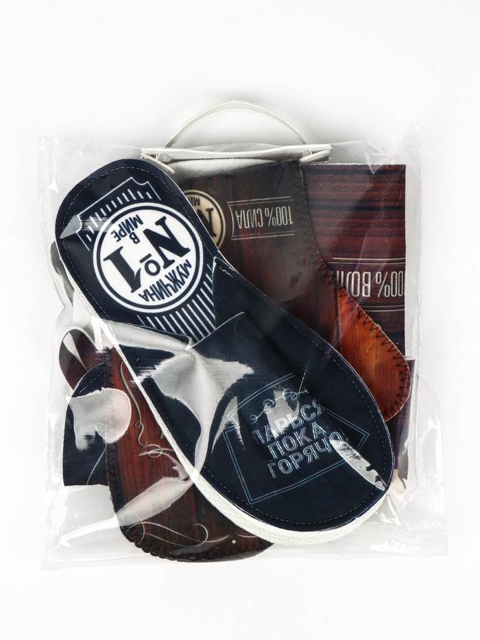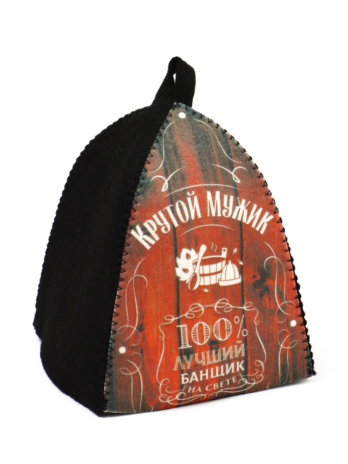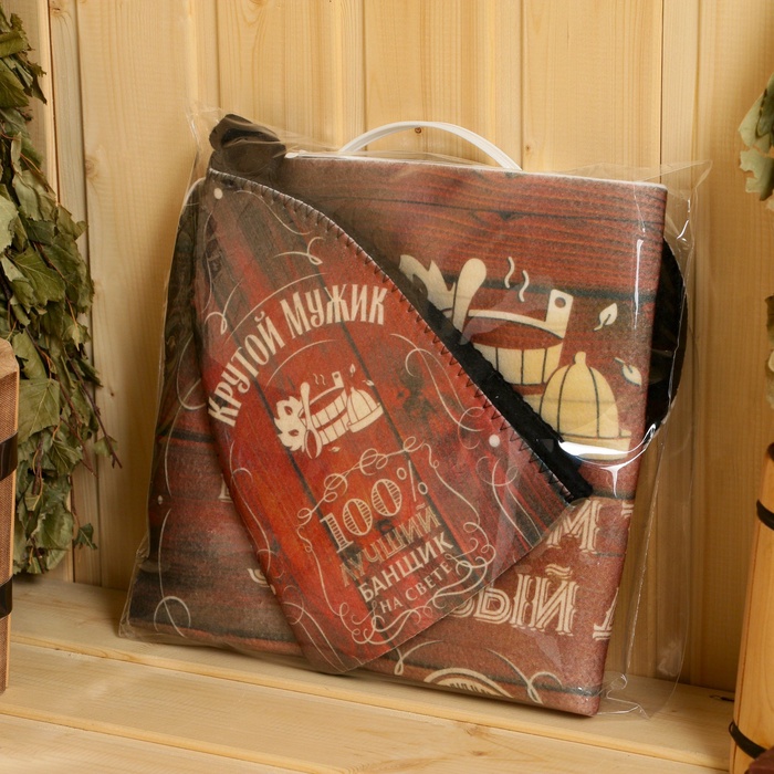 - Яркий мужской дизайн: тёмная гамма и тематический принт «Крутой мужик» сразу задают настроение. Такой набор выделяется в бане и отражает характер своего владельца.